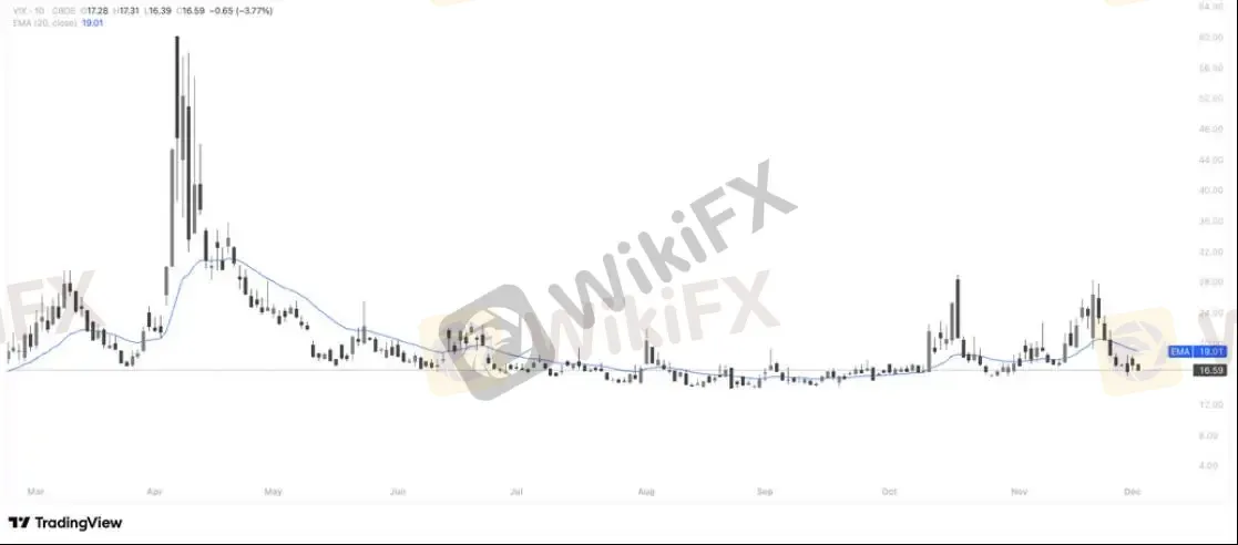 从图表看,VIX 已回到 16.5 一线,并再次跌破 20 日 EMA,市场风险情绪较为平稳。近期 11 月中旬的波动峰值未能延续,恐慌指数进入横盘偏弱结构,显示宏观风险事件的扰动正在淡化。