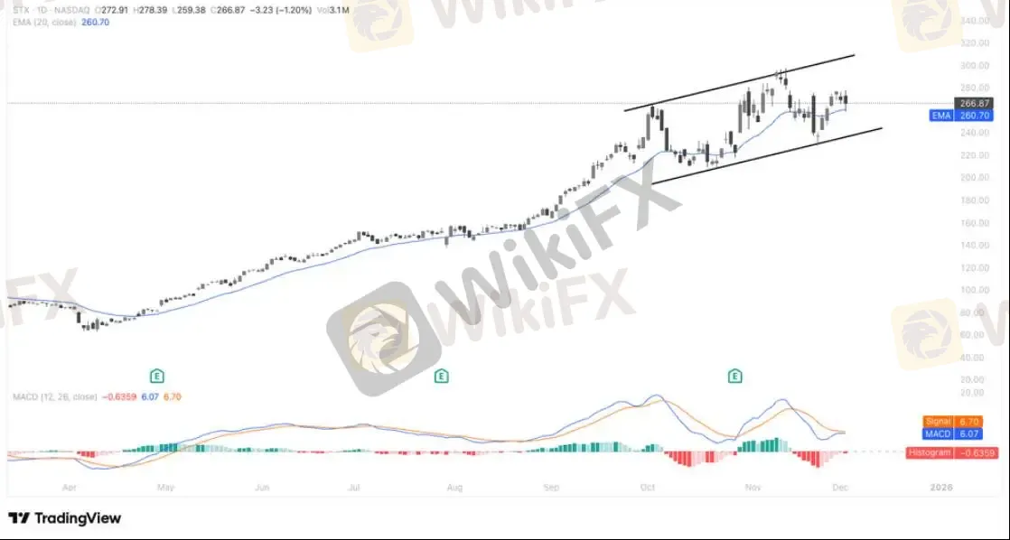 技术面显示STX正在沿着中期上升通道运行,短线完成对20日均线的有效回踩后重新站稳,显示多头结构依旧牢固;价格保持在通道中轨上方震荡整理,反映强势区间内的健康换手,而 MACD 双线低位粘合企稳,预示动能有望再度向上修复。若后市向上突破通道上沿,将打开下一轮趋势延伸空间;而通道下轨与 20 日均线构成的支撑带仍是当前趋势结构的关键防线。
