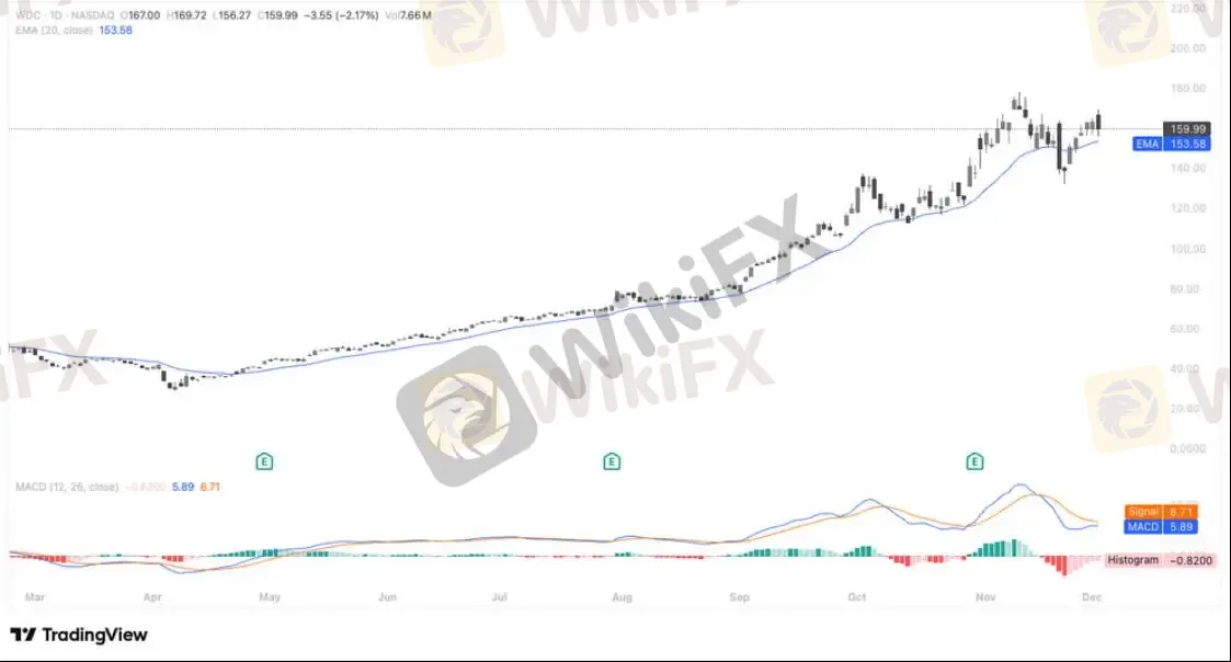 WDC 回踩 20 日均线获得支撑后重新走稳,整体结构保持在强势区间内震荡上行;近期横盘整理呈现典型的强趋势休整形态,筹码并未出现明显松动。MACD 双线在高位回落后逐步趋于粘合,显示动能正在完成从调整向再度转强的过渡。只要价格持续守在 150–155 区间上方,短线仍具备再度向前高发起冲击的条件,趋势主导权依旧掌握在多头手中。