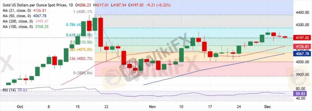 黄金已进入上行盘整阶段,在 $4,200 大关附近的熟悉区间内震荡,等待更多美国就业数据为 12 月货币政策会议之后的美联储利率前景提供新的暗示。