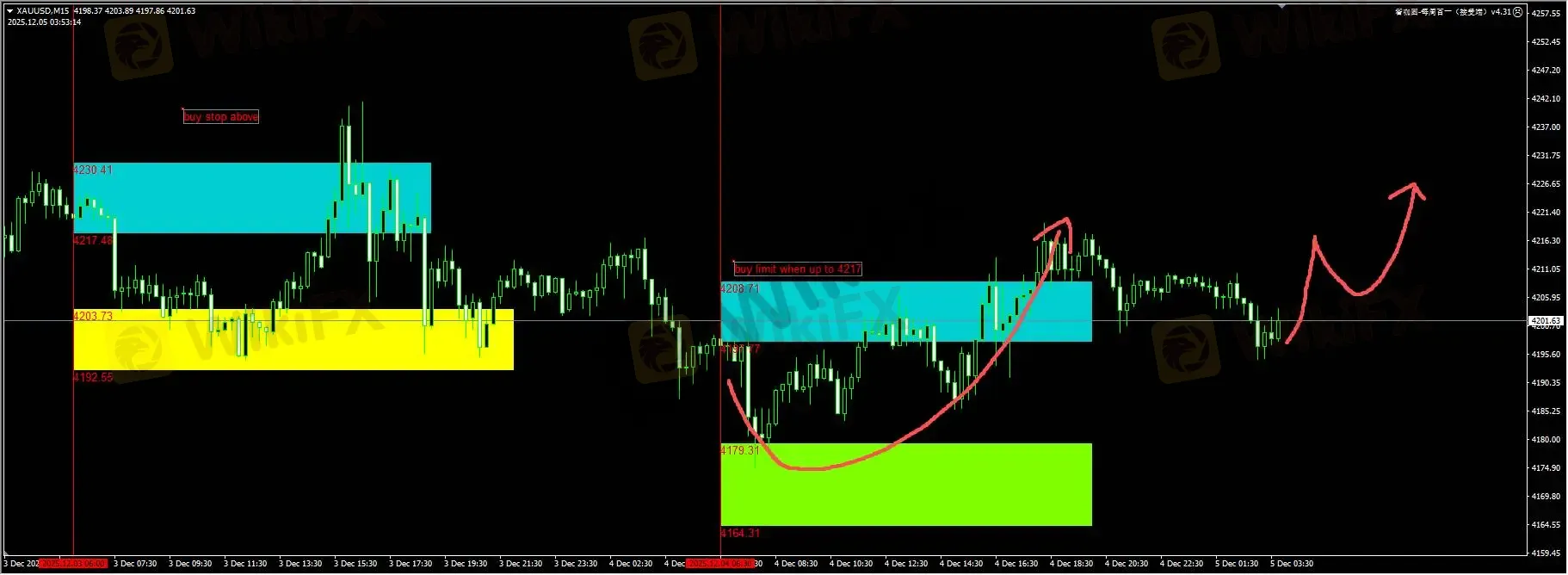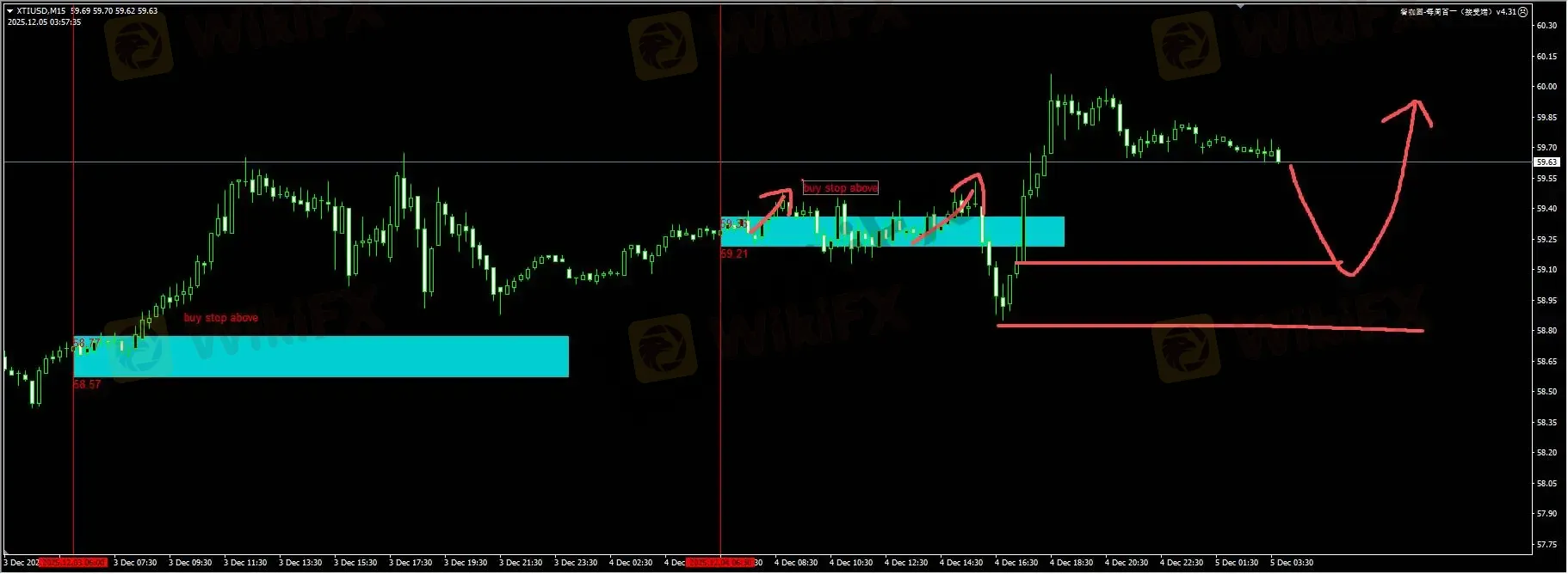 原油:昨天我们插件蓝色区域的buy stop表现一般,有几次毛刺。日内我们建议关注59.20-58.80区域的需求区回踩,可以考虑1次buy limit操作。详细位置请咨询插件。