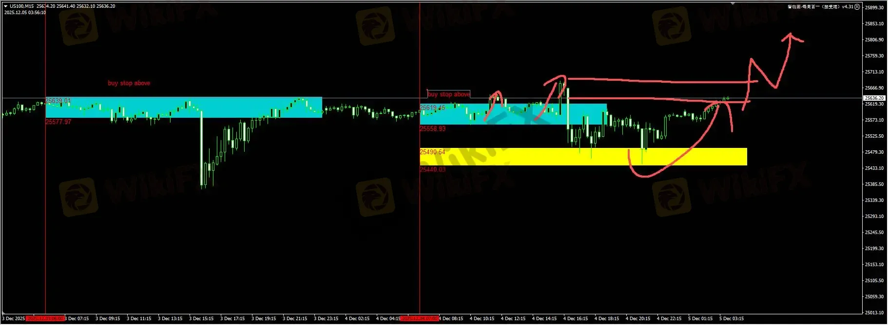 纳指:昨天我们插件提醒的蓝色buy stop只能实现大约1倍的盈亏比。但下方黄色区域的流动性低扫还是如期出现。日内我们关注隔夜供给区阻力25680能否有效突破,突破后我们才继续考虑做多的操作。详细位置请咨询插件。