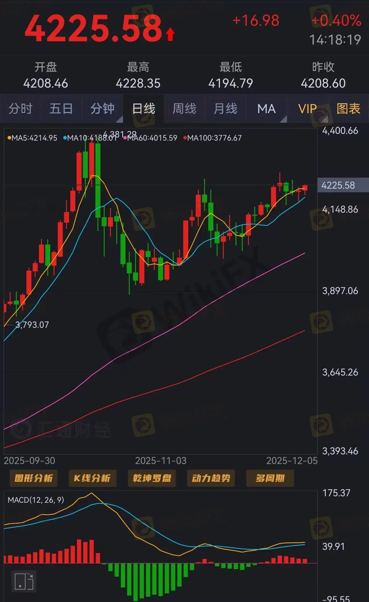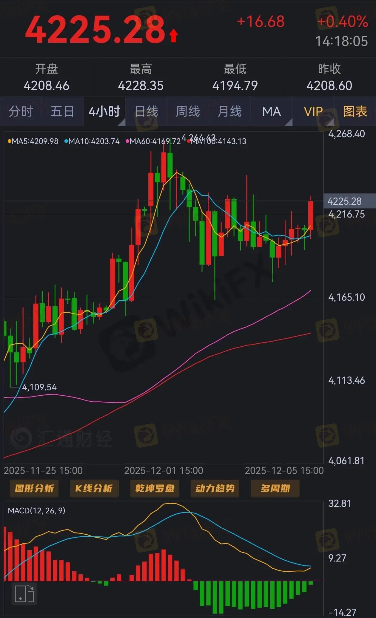 摘要:从上面日线图上可以看出,国际金价是有支撑的,多头是占据优势的。没下挫,反而是盘整,日线又破了昨天高点。明显应该做多。从四小时来看,macd有零轴上方金叉的迹象,尽管没有形成金叉,但K线组合上明显也是走多形态。如果切换到布林上来看,后市也是看上轨。所以后面至少要去测试一次4264的压力。随着12月利率决议的日趋临近,金价还会受降息预期的利好而走一波上涨。自周一以来的下跌,没有力度。所以只能说,跌的费