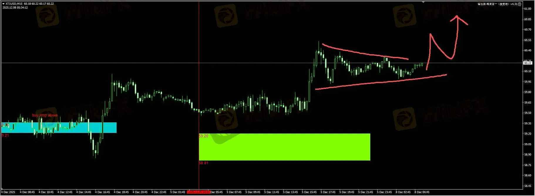 原油:价格虽然没有回到我们插件绿色buy limit的区域,但经过拉升之后,进入了收敛整理的格局。日内应当保持突破回踩买入的策略为主。详细位置请咨询插件。