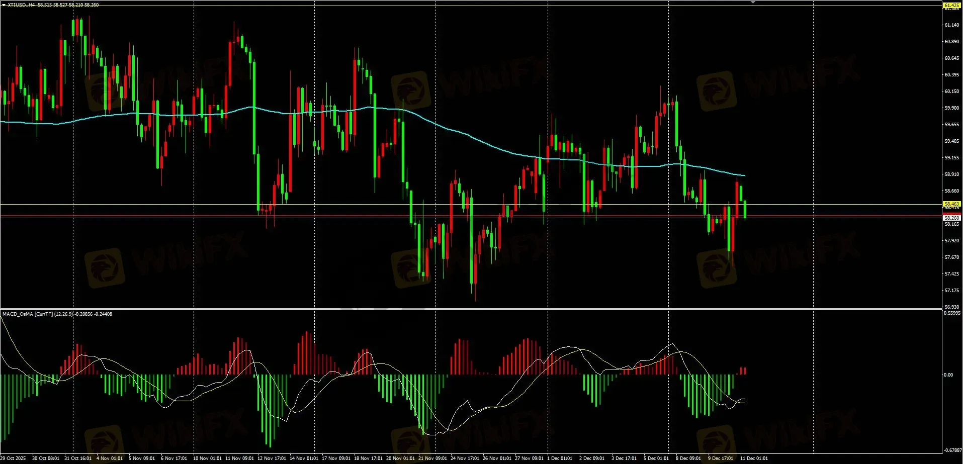 日内策略:昨日窄幅震荡,晚间快速下跌后反转拉升,日线收阳。今日早盘小幅下跌,多周期不共振,没有明显方向,优先考虑震荡操作,建议轻仓短线,上方压力关注H1级别144均线,完成上破可尝试短多,短线支撑关注58.2-58.0,有效下破可尝试短空。