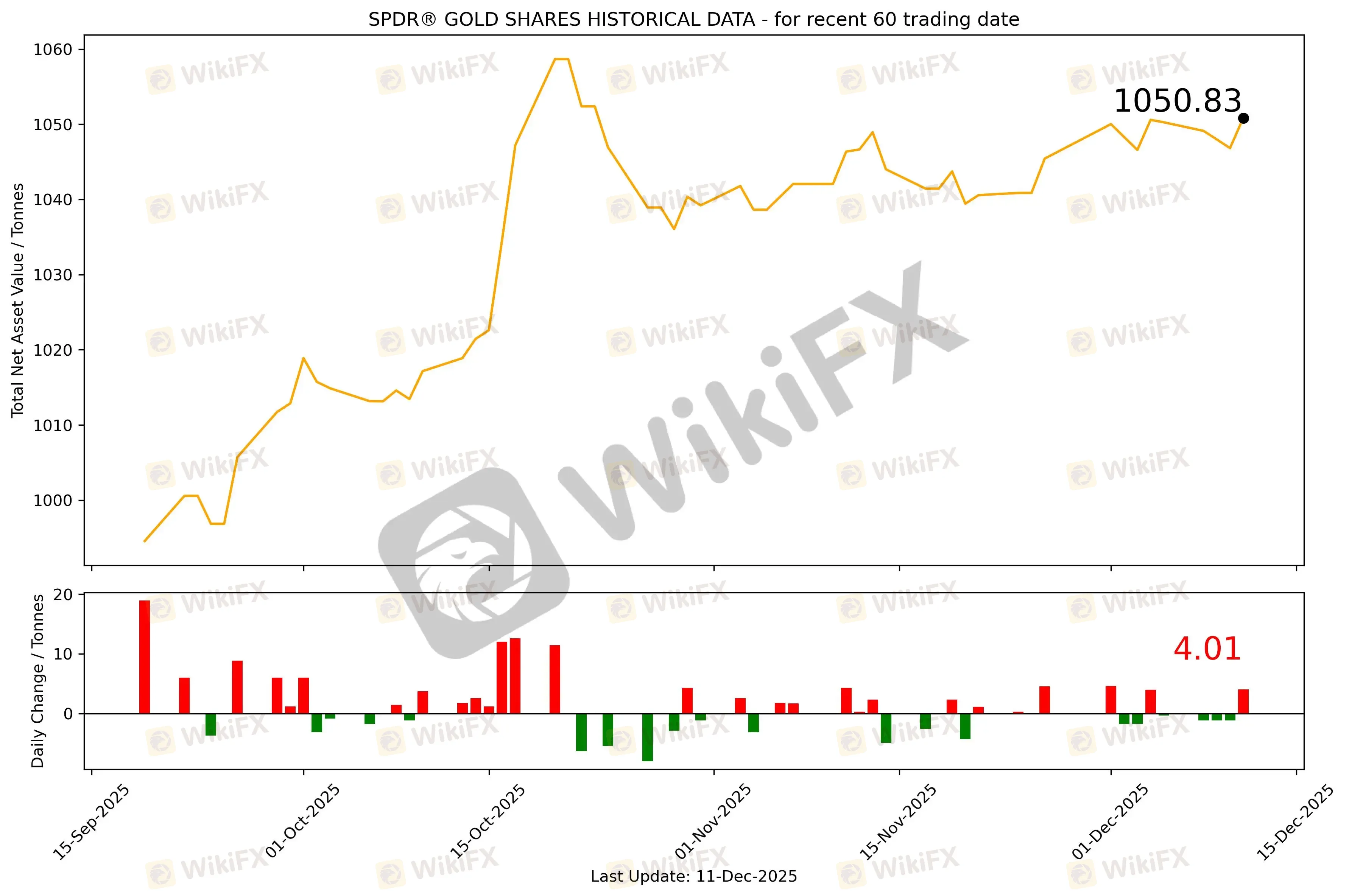 截至12月11日,全球最大的黄金ETF SPDR Gold Trust持仓量为1050.83吨,较上一个交易日增加4.01吨。12月11日现货黄金自4228.56美元/盎司开盘后延续前日涨势继续上行至4250美元附近,随后震荡下行,最低向下触及4204.2美元/盎司。美盘盘前受初请失业金人数影响多头重新进攻,最高向上触及4285.98美元/盎司,最终收于4279.21美元/盎司,涨51.565美元或1.22%。