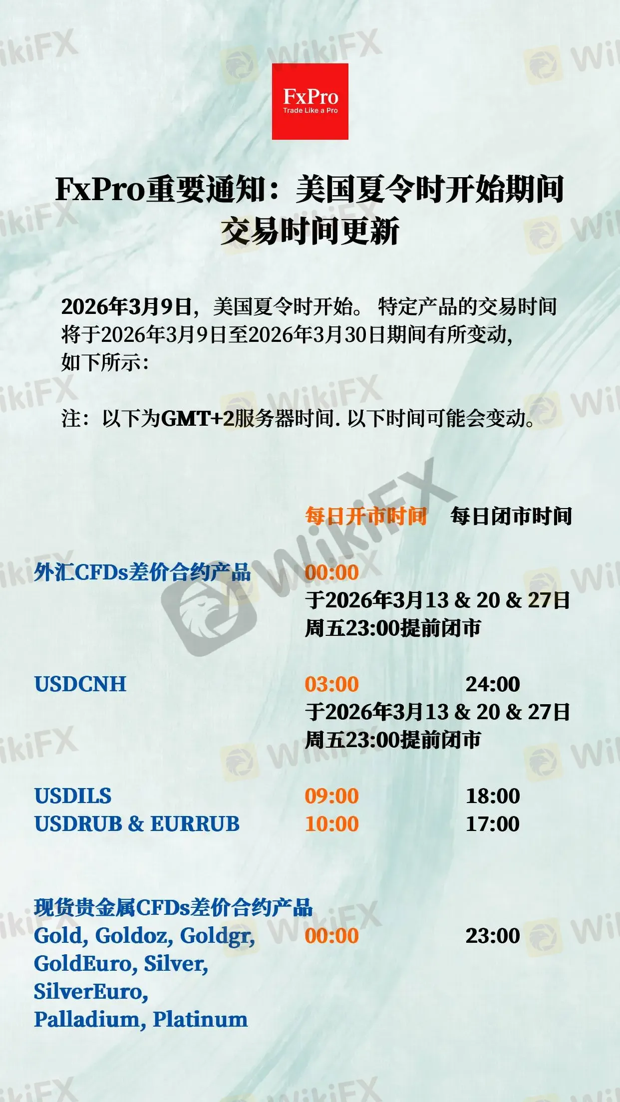 FxPro重要通知:美国夏令时开始期间交易时间更新