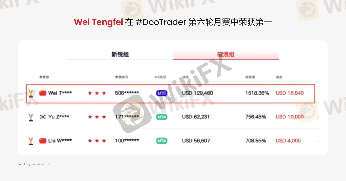 如果说 Aruna 展现了交易的“守”,那么 Wei Tengfei 则向我们展示了交易的“攻”。1518.36% 的背后,是精准的判断、过人的胆识以及对市场的绝对支配欲。在 #DooTrader 的舞台上,这种“破浪”的精神正是大赛最具魅力的地方。