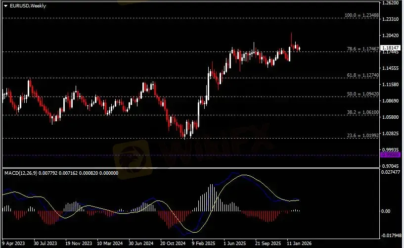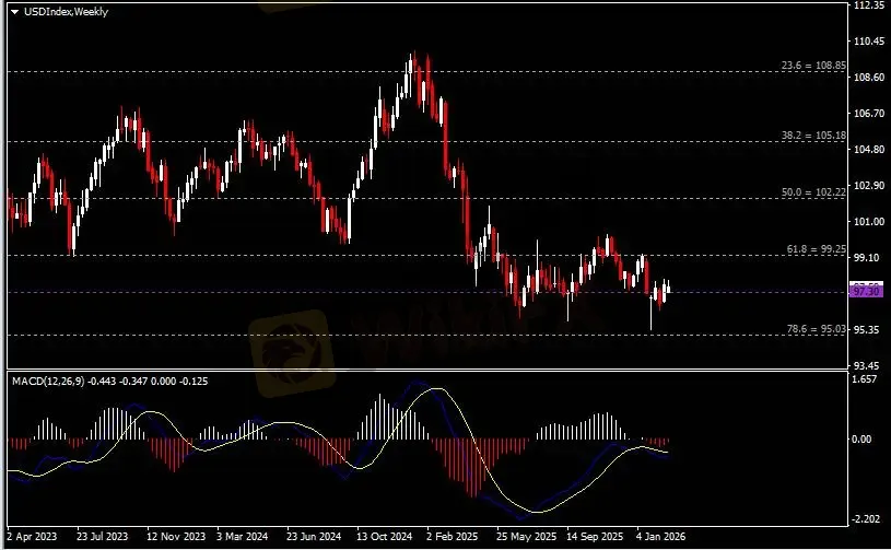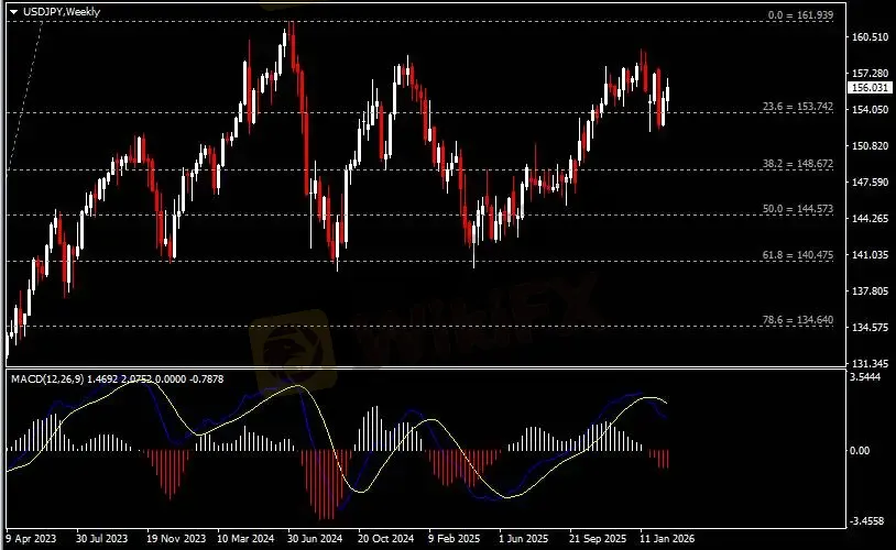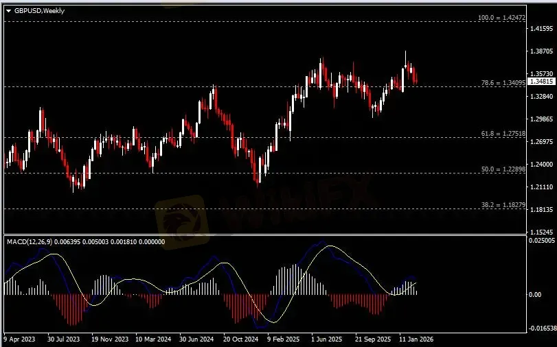 周线图显示美元兑日元反弹上行,当前收于153.70支撑。从MACD来看,快慢线向下运行,红色动能柱则温和收缩。汇价走势基本和动能柱的变化一致。