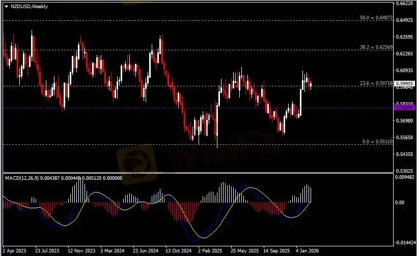 周线图显示纽元兑美元企稳回涨,当前收于0.5970支撑。从MACD来看,快慢线向上运行,白色动能柱则温和收缩。汇价走势和动能柱的变化呈分歧。