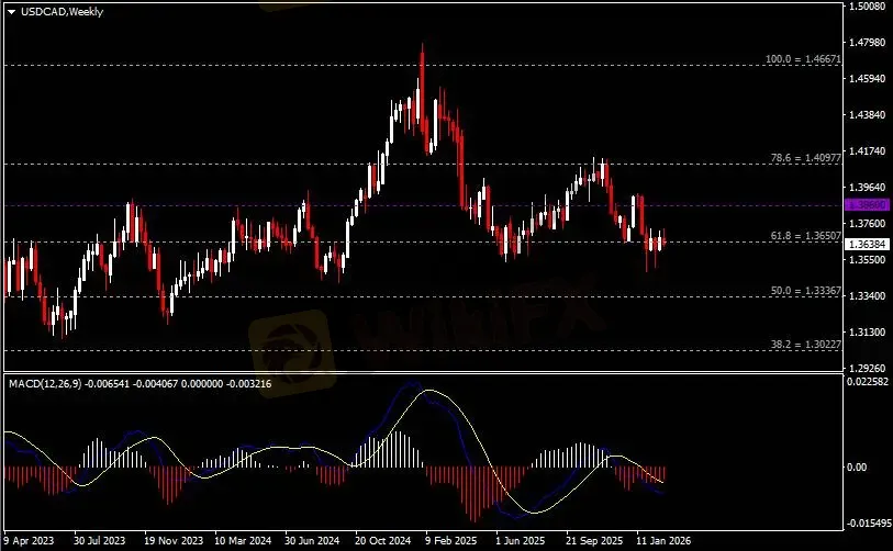 周线图显示美元兑加元震荡下跌,当前测试1.3650支撑。从MACD来看,快慢线向下运行,红色动能柱则温和收缩。汇价走势和动能柱的变化呈分歧。