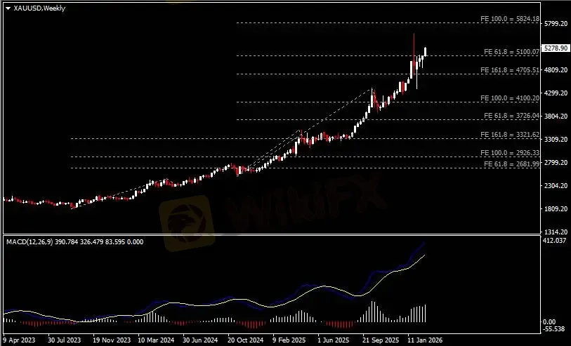 周线图显示金价震荡上行,当前收于前高试5100。从MACD来看,快慢线向上扩张,白色动能柱持续放量。金价走势基本和动能柱的变化一致。