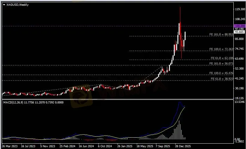 周线图显示银价强势上涨,当前收于前高89。从MACD来看,快慢线拐向上行,白色动能柱略恢复增量。银价走势基本和动能柱的变化一致。