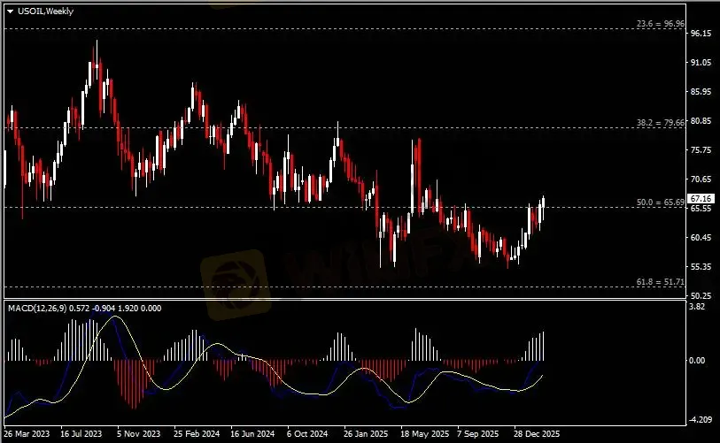 周线图显示油价震荡上涨,当前收于前高65.70。从MACD来看,快慢线向上扩张,白色动能柱持续放量。油价走势基本和动能柱的变化一致。