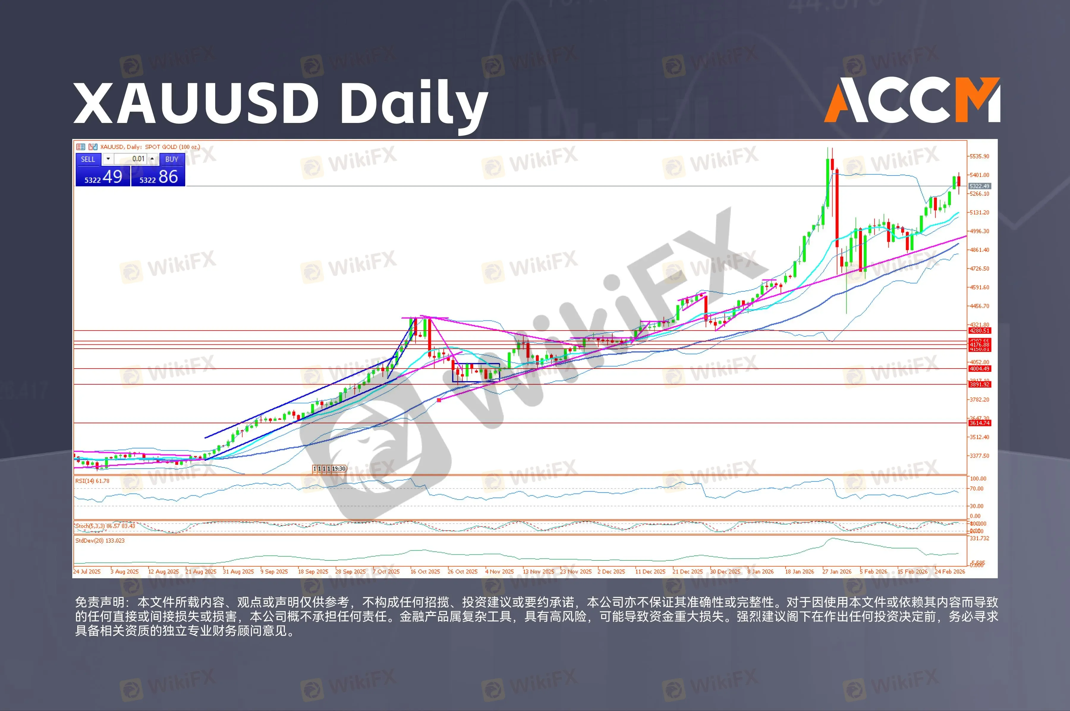 现货黄金上涨0.9%,报每盎司5,332美元,盘中一度触及5,419美元,为1月底以来最高水平。