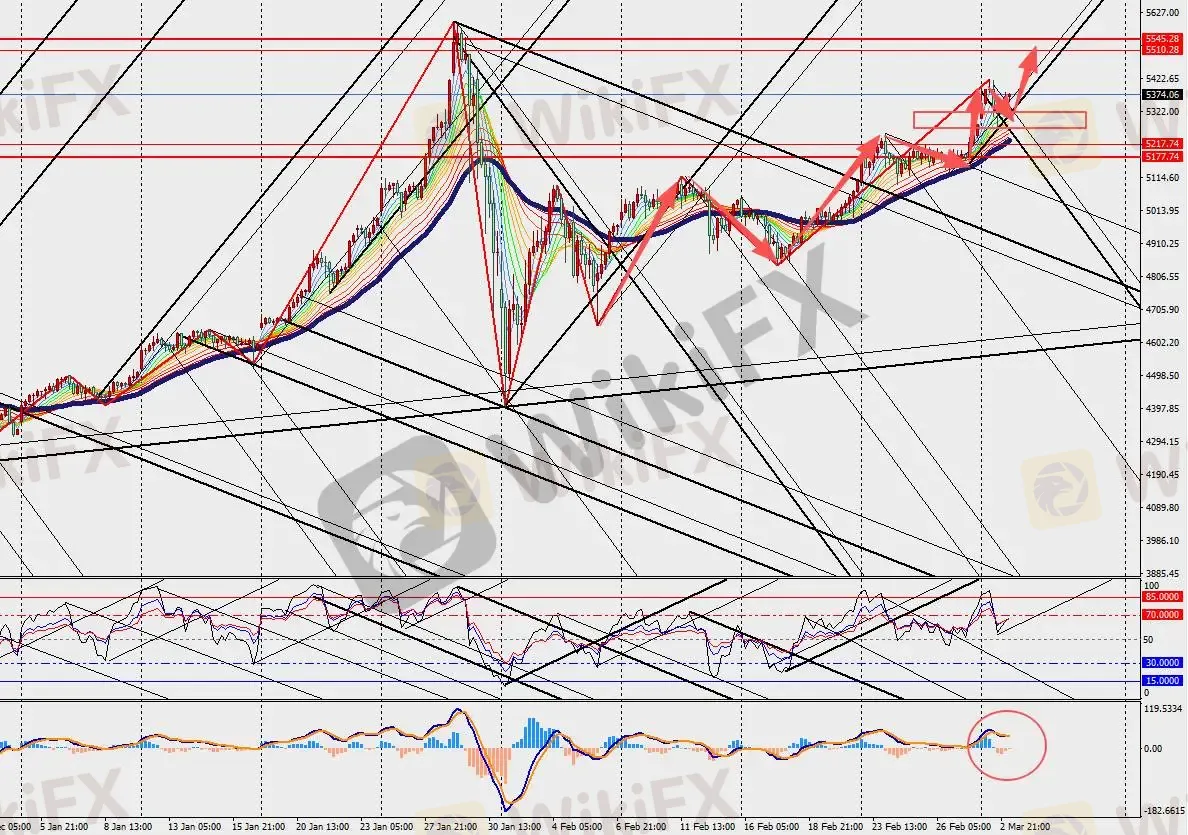 黄金H4级别高位震荡,MACD双线和量能柱在零轴上方逐步收敛。投资者将密切关注本周即将公布的一系列美国劳动力数据,包括ADP就业报告、每周初请失业金人数和非农就业报告。