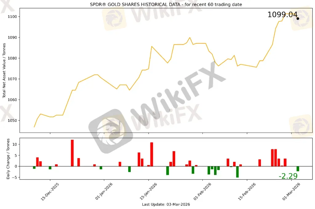 截至2026年03月03日,全球最大的黄金ETF SPDR Gold Trust持仓量为1099.04吨,较上一个交易日减少2.29吨。2026年03月03日现货黄金自5323.15美元/盎司高开后上行遇阻,最高向上触及5379.867美元/盎司,随后震荡下行。欧盘交易时间波动放大,美盘交易时间跌破5000美元关口,最低向下触及4996.36美元/盎司,最终收于5088.52美元/盎司,跌233.4美元或4.39%。