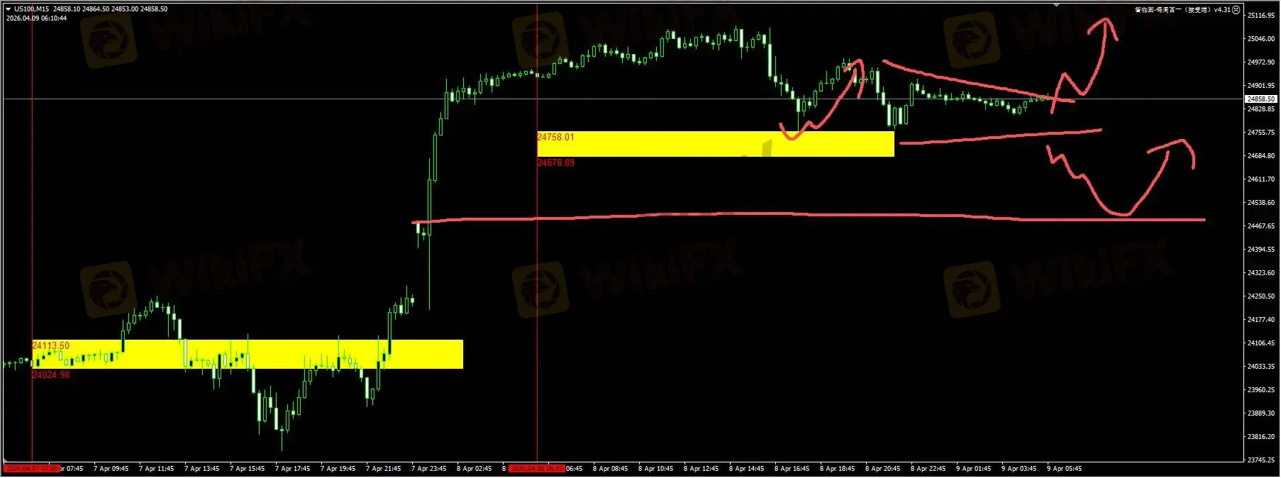纳指:我们插件昨天提醒下方黄色区域扫流动性的行情,价格虽然没有跌破黄色区域,但也在触及之后发生了明显的反弹走势。目前价格重新开始收敛整理,日内关注向上突破的信号可以尝试一次。或者等待扫荡24500下方流动性之后再找反弹信号。详细位置请咨询插件。