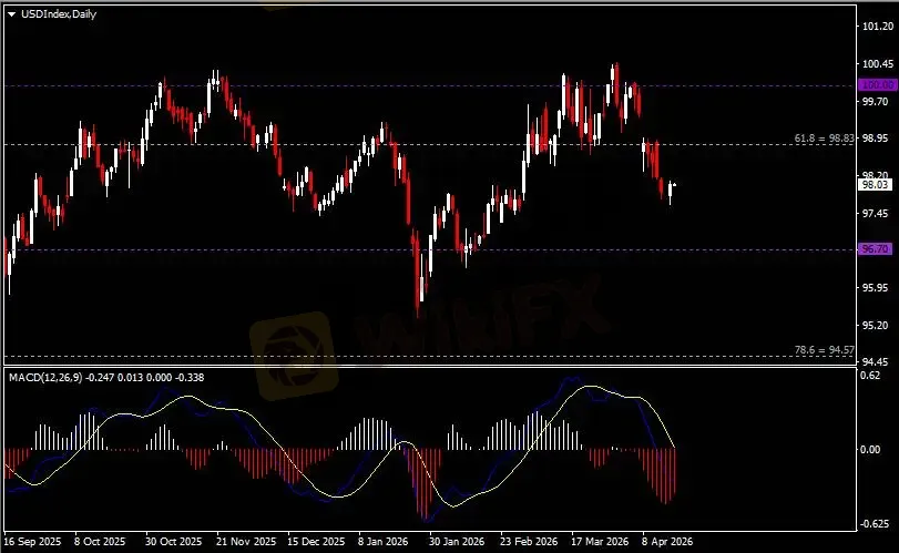 日线图显示美元指数企稳反弹,当前仍承压于98.80阻力。从MACD来看,快慢线向下运行,红色动能柱则温和收缩。指数走势基本和动能柱的变化一致。