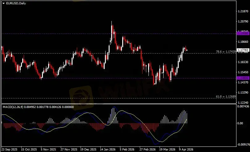 日线图显示欧元兑美元高位回调,当前仍收于1.1740支撑。从MACD来看,快慢线向上运行,白色动能柱则温和收缩。汇价走势基本和动能柱的变化一致。