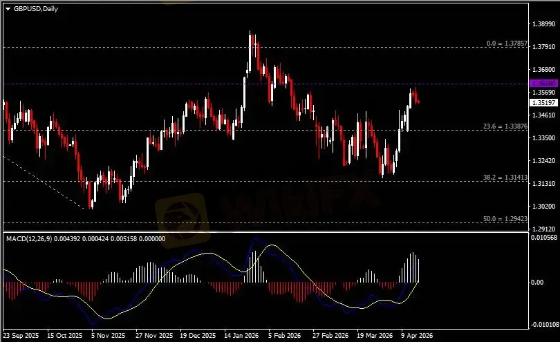 日线图显示英镑兑美元高位回调,当前承压于1.3610阻力。从MACD来看,快慢线向上扩张,白色动能柱则温和收缩。汇价走势基本和动能柱的变化一致。