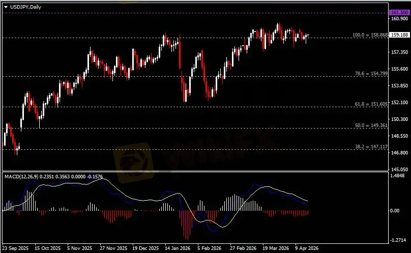 日线图显示美元兑日元于高位区间震荡,当前收于158.90支撑。从MACD来看,快慢线向下运行,红色动能柱则温和收缩。汇价走势基本和动能柱的变化一致。