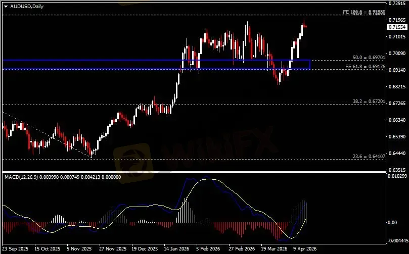 日线图显示澳元兑美元先涨后跌,当前承压于0.7230阻力。从MACD来看,快慢线向上运行,白色动能柱则温和收缩。汇价走势基本和动能柱的变化一致。