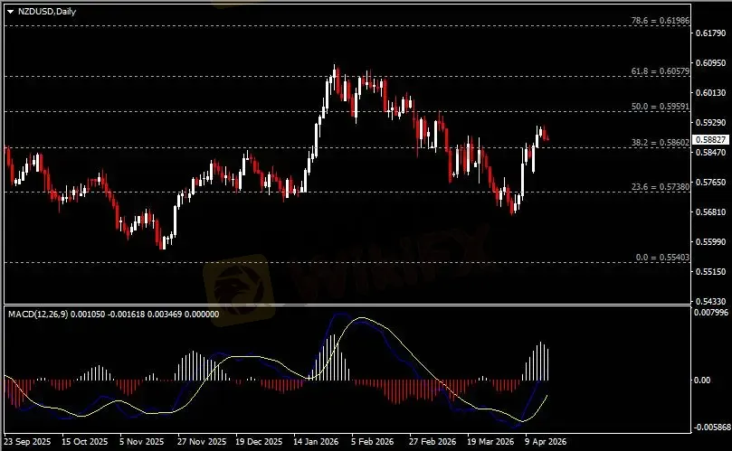 日线图显示纽元兑美元回调下挫,当前仍收于0.5860支撑。从MACD来看,快慢线向上扩张,白色动能柱则温和收缩。汇价走势基本和动能柱的变化一致。