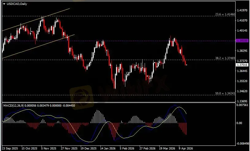 日线图显示美元兑加元震荡走弱,当前收于前低1.3750。从MACD来看,快慢线向下运行,红色动能柱温和放量。汇价走势基本和动能柱的变化一致。
