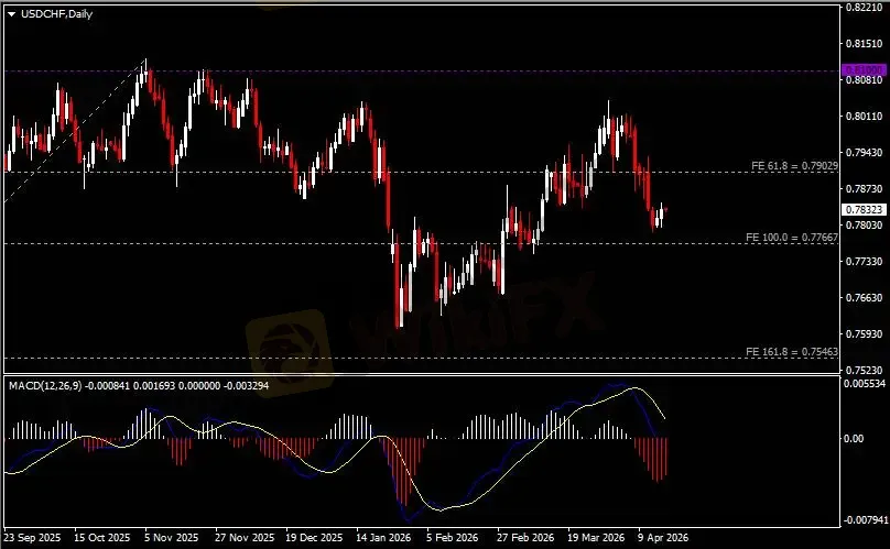 日线图显示美元兑瑞郎反弹上行,当前仍承压于0.79关键阻力。从MACD来看,快慢线向下运行,红色动能柱则温和收缩。汇价走势基本和动能柱的变化一致。