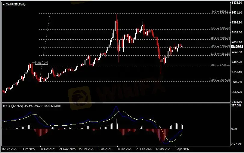 日线图显示金价持稳于4760支撑。从MACD来看,快慢线向上运行,白色动能柱则温和收缩。金价走势基本和动能柱的变化一致。