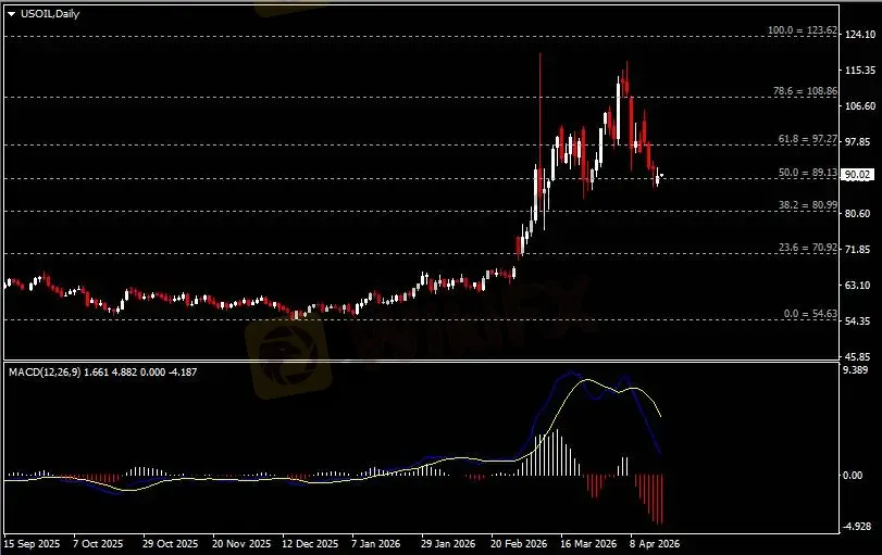 日线图显示油价企稳收涨于89关键支撑。从MACD来看,快慢线向下扩张,红色动能柱则温和收缩。油价走势基本和动能柱的变化一致。