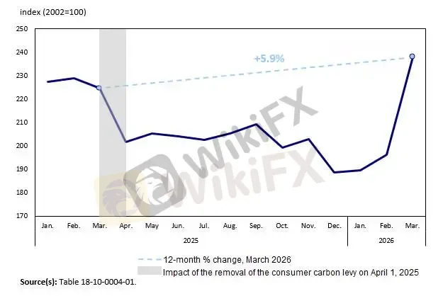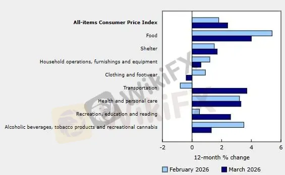 加拿大3月CPI同比飙升至2.4%(此前1.8%),环比亦跳涨至0.9%,为14个月以来高位。中东冲突引发的供应冲击带动了整体通胀升温。其中,汽油价格同比上涨了5.9%,环比大幅飙升21.2%,创下有纪录以来最大涨幅。