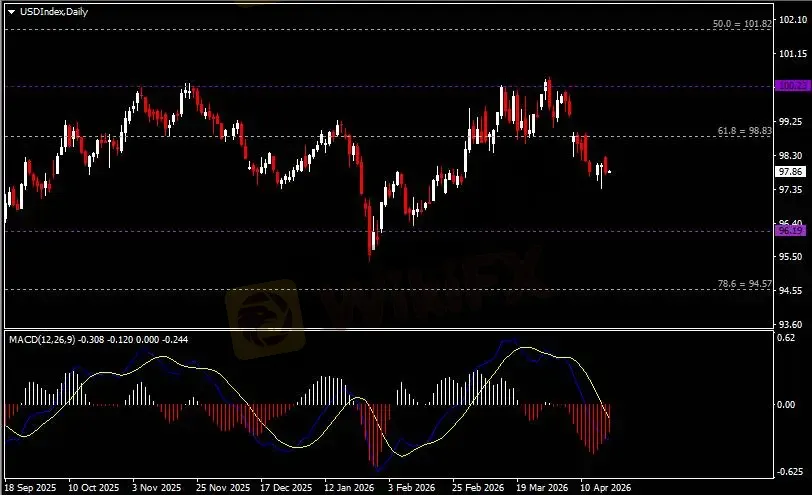 日线图显示美元指数高开下挫,当前仍承压于98.80阻力。从MACD来看,快慢线向下运行,红色动能柱则温和收缩。指数走势和动能柱的变化呈分歧。