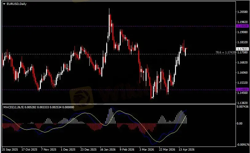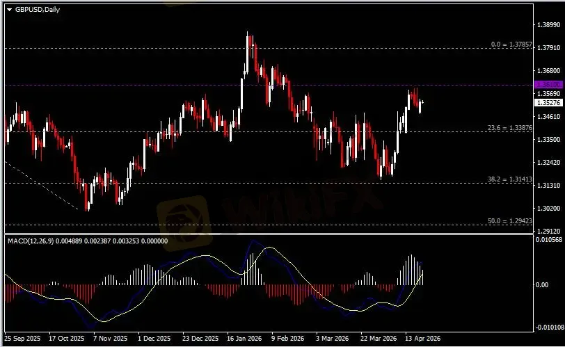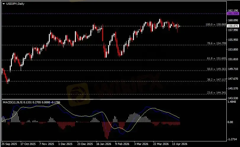 日线图显示美元兑日元于高位区间震荡,当前测试158.90支撑。从MACD来看,快慢线向下运行,红色动能柱则温和收缩。汇价走势和动能柱的变化稍有分歧。
