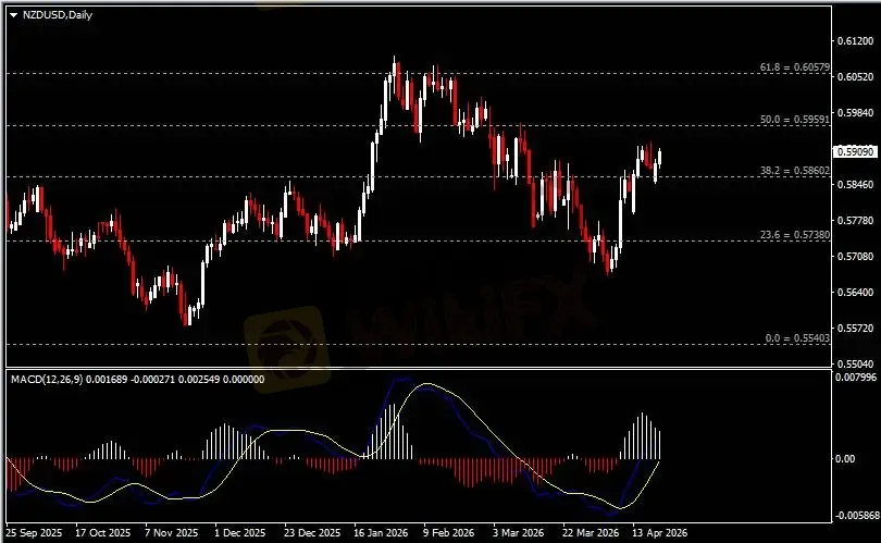 日线图显示纽元兑美元反弹上行,当前收于0.5860支撑。从MACD来看,快慢线向上运行,白色动能柱则温和收缩。汇价走势和动能柱的变化呈分歧。