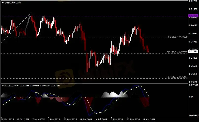 日线图显示美元兑瑞郎震荡下跌,当前逼近0.7770支撑。从MACD来看,快慢线向下运行,红色动能柱则温和收缩。汇价走势和动能柱的变化呈分歧。