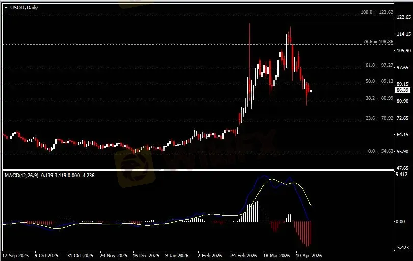 日线图显示油价震荡下挫,当前承压于89阻力。从MACD来看,快慢线向下运行,红色动能柱则温和收缩。油价走势和动能柱的变化呈分歧。