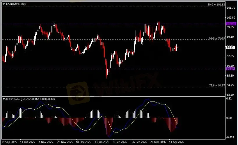 日线图显示美元指数反弹上行,当前仍承压于98.80阻力。从MACD来看,快慢线呈拐向,红色动能柱温和收缩。指数走势基本和动能柱的变化一致。