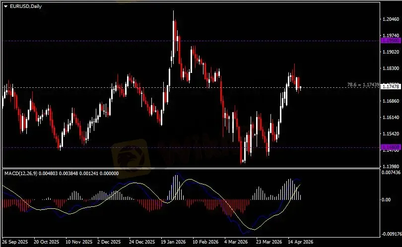 日线图显示欧元兑美元回调下跌,当前测试1.1740支撑。从MACD来看,快慢线呈拐向,白色动能柱温和收缩。汇价走势基本和动能柱的变化一致。