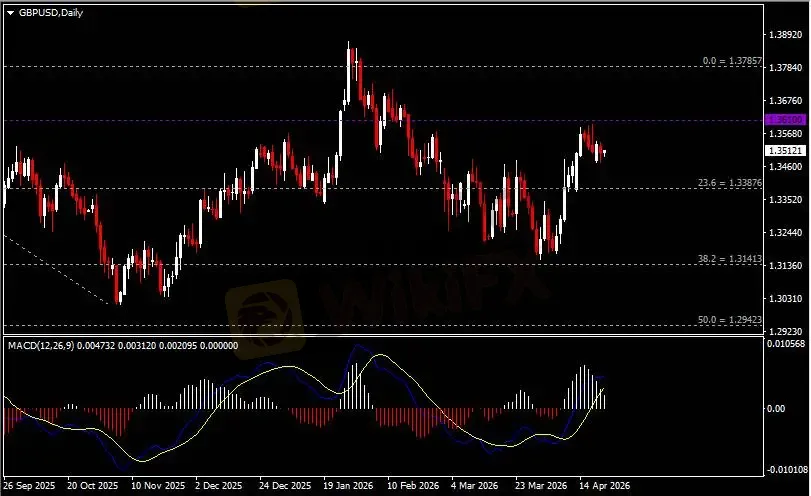 日线图显示英镑兑美元回调下挫,当前承压于1.3610阻力。从MACD来看,快慢线呈拐向,白色动能柱温和收缩。汇价走势基本和动能柱的变化一致。