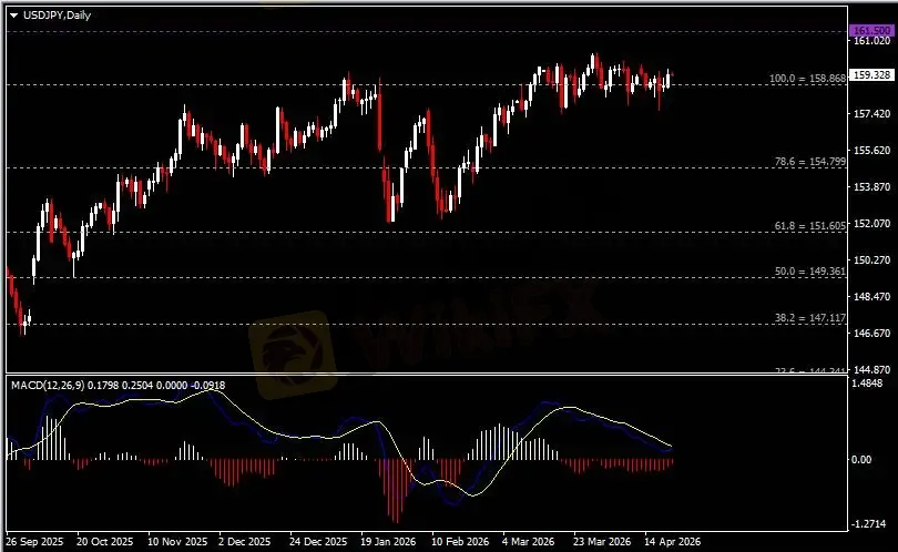 日线图显示美元兑日元于高位区间震荡,当前收于158.90支撑。从MACD来看,快慢线呈拐向,红色动能柱温和收缩。汇价走势基本和动能柱的变化一致。