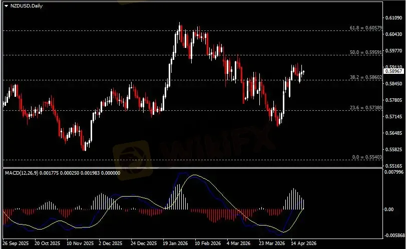 日线图显示纽元兑美元反弹上行,当前收于0.5860支撑。从MACD来看,快慢线向上运行,白色动能柱则温和收缩。汇价走势和动能柱的变化呈分歧。