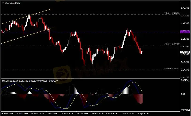 日线图显示美元兑加元跌势暂缓,当前承压于1.3750阻力。从MACD来看,快慢线向下运行,红色动能柱则温和收缩。汇价走势基本和动能柱的变化一致。