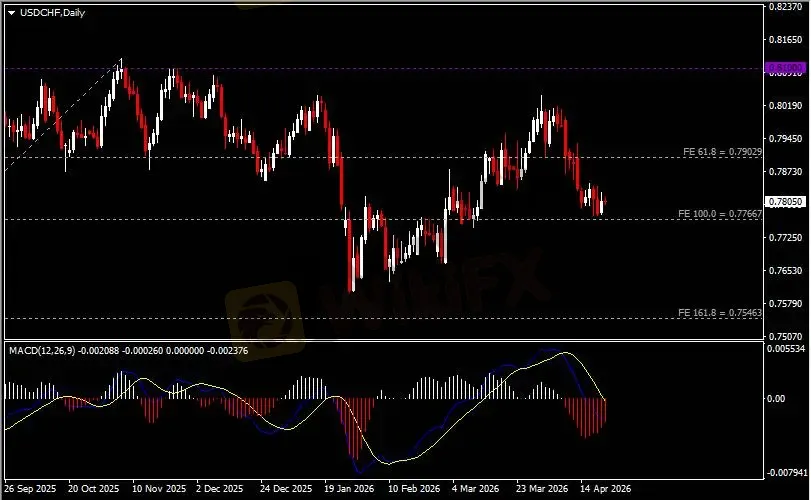 日线图显示美元兑瑞郎企稳收涨于0.7770支撑。从MACD来看,快慢线向下运行,红色动能柱则温和收缩。汇价走势基本和动能柱的变化一致。