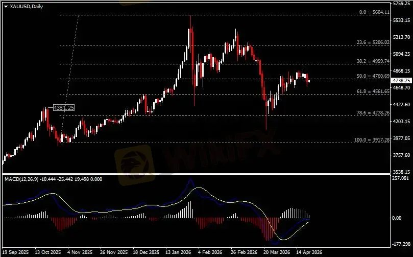 日线图显示金价回调走弱,当前收于前低4760。从MACD来看,快慢线呈拐向,白色动能柱温和收缩。金价走势基本和动能柱的变化一致。