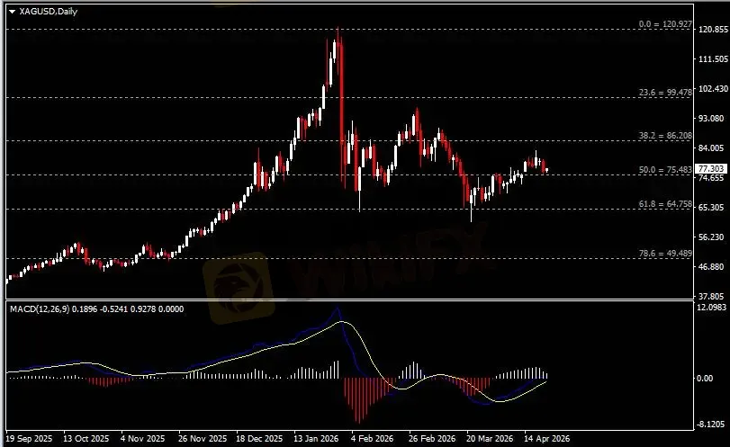 日线图显示银价回调下挫,当前逼近75.50支撑。从MACD来看,快慢线逐渐收窄,白色动能柱则温和收缩。银价走势基本和动能柱的变化一致。
