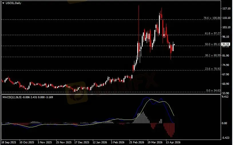 日线图显示油价企稳反弹,当前测试89关键阻力。从MACD来看,快慢线向下运行,红色动能柱则温和收缩。油价走势基本和动能柱的变化一致。