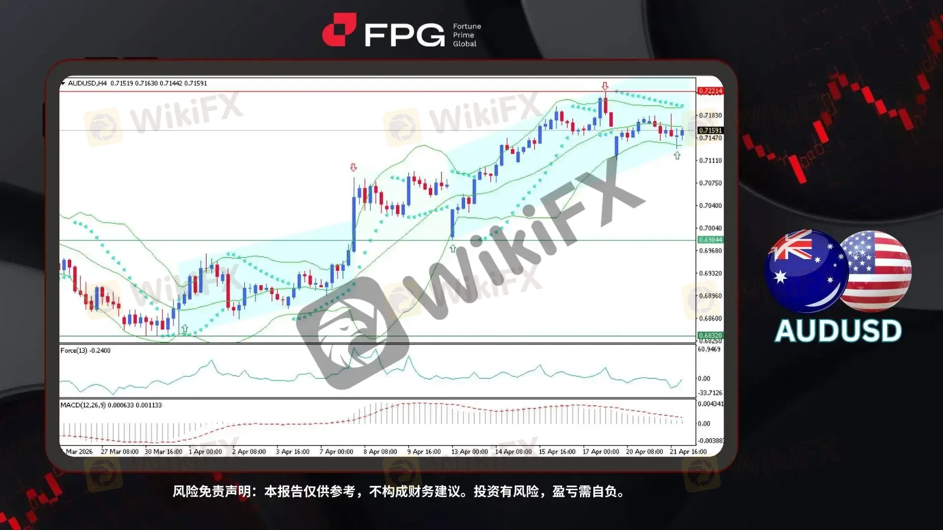 摘要:在 H4 时间框架图上,AUDUSD 显示出一个稳固的看涨结构,价格持续在明确的上升通道内运行。这一轮上涨始于 0.6832,随后在 0.6984 至 0.7090 区间进入整理阶段,之后价格恢复上行走势。持续的看涨动能已将汇价推升至更高水平,目前价格约在 0.7159 附近交易。短期来看,价格似乎进入整理阶段,暗示在维持整体看涨前景的同时,可能出现暂时性停顿。从技术面来看,布林带呈现适度扩张,反