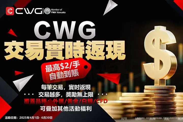 即日起至2025年6月30日,參與CWG指定交易,單筆最高可獲$2/手返現,實时到賬,無需等待! 涵蓋外匯、黃金、白銀、CFD等熱門品種,交易越多,獎勵越多,更可疊加其他福利活動,輕鬆加碼收益!